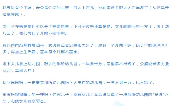 如下图所示,这位家长从孩子学前教育开始,就规划了孩子的教育方向,坚决让孩子去上贵族幼儿园,虽然孩爸的是公司主管,不过一年10万的学费对这个普通家庭来说负担太重了。